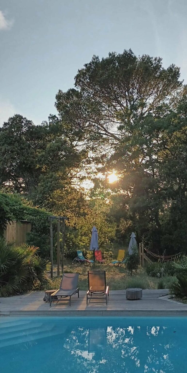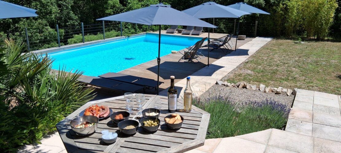 - Un grand espace piscine partagé est situé dans un cadre particulièrement idyllique. Il comprend une cuisine d’été avec four à pizzas et barbecue (plancha en été).